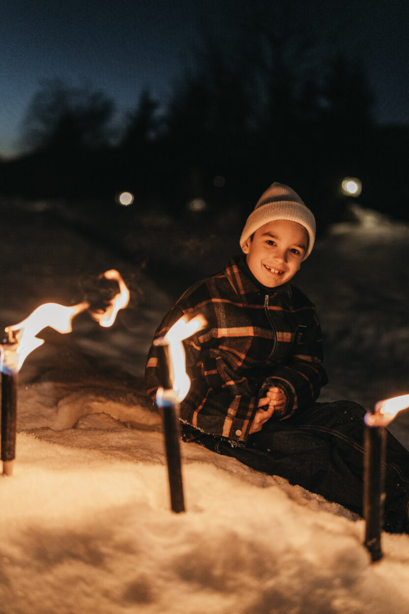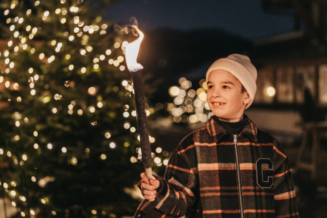 Romantisch durch die Winterlandschaft spazieren – an der Rezeption erhältst du gratis Fackeln zum Ausleihen.